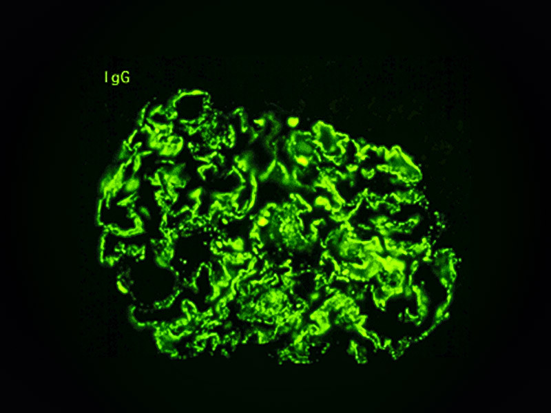 A Imunofluorescência é uma técnica laboratorial que permite a visualização de antígenos em material não fixado de biópsias (em geral, pele e rim) para demonstrar a presença de imunoglobulinas. O método utiliza corantes fluorescentes, que absorvem luz e a emitem num determinado comprimento de onda, facilitando a visualização no microscópio.